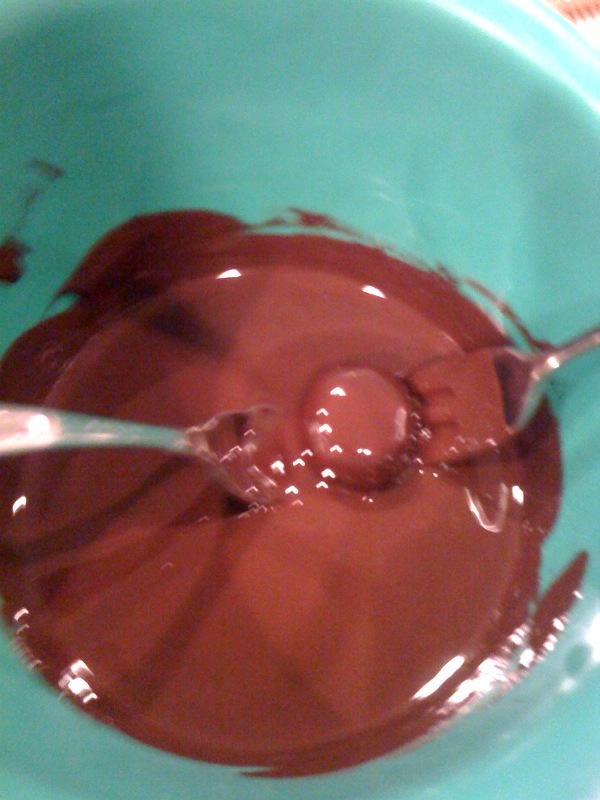 Chocolate after melting, and ready for cookie balls to be dipped. |